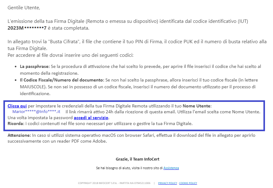 Se in fase di acquisto è stata richiesta l’associazione del certificato di firma ad un indirizzo e-mail differente rispetto a quello del proprio account shop Infocert, nell’email di conferma di emissione del certificato sarà presente il link necessario per impostare le credenziali legate alla nuova utenza scelta (oltre al file contenente i codici PIN e PUK accessibile tramite la passphrase impostata precedentemente):