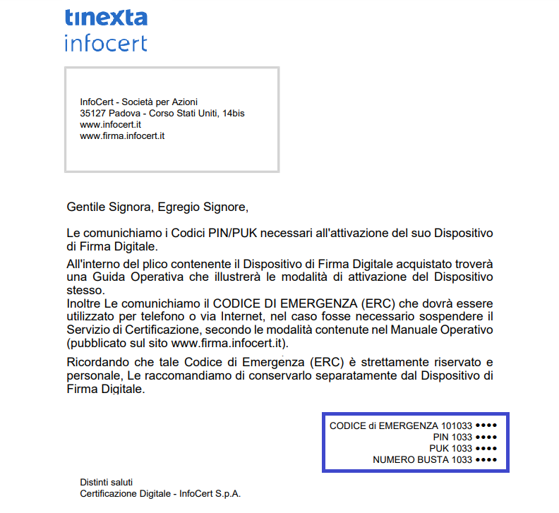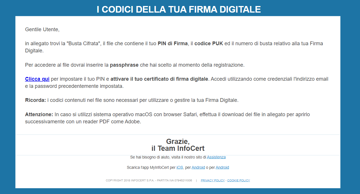 Dopo aver completato la procedura di registrazione per la richiesta di un certificato di firma digitale (remota), sarà ricevuta una e-mail contenente il file con i Codici di attivazione, ovvero il file accessibile tramite la passphrase precedentemente impostata, al cui interno sono contenuti i codici PIN e PUK e il link per procedere con l’attivazione del certificato.