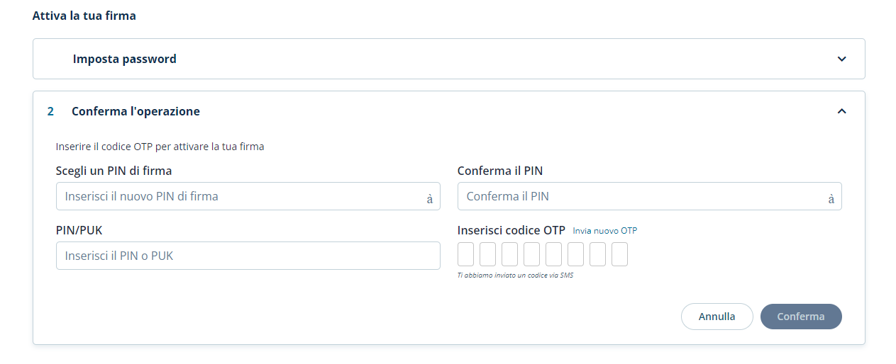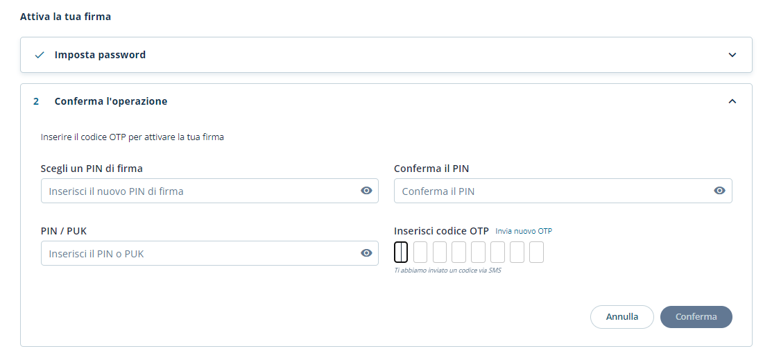Dopo aver digitato il pin una seconda volta e aver digitato l’otp ricevuto, procedere con un clic sul pulsante Conferma e completare l'attivazione del certificato di firma digitale remota.