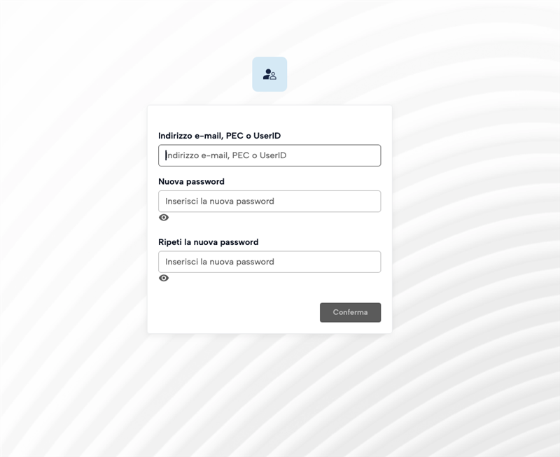 La pagina prevede l’inserimento di una nuova password, che sarà scelta rispettando le indicazioni fornite: una lunghezza di almeno 8 caratteri, caratteri maiuscoli e minuscoli al suo interno, uno o più numeri, almeno un carattere speciale e non più di due caratteri identici consecutivi.