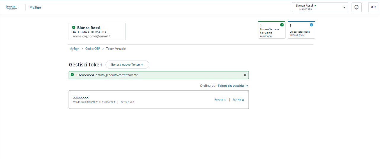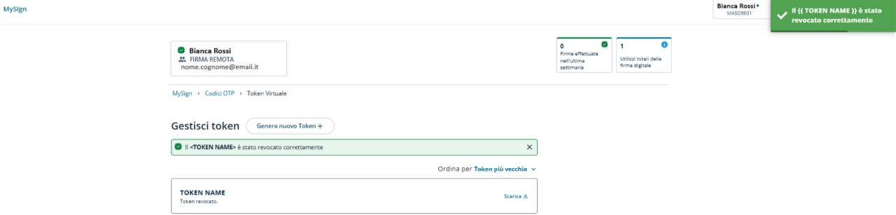 Al termine dell’operazione si visualizzerà la conferma del Token generato e la possibilità di revocare o scaricare lo stesso.