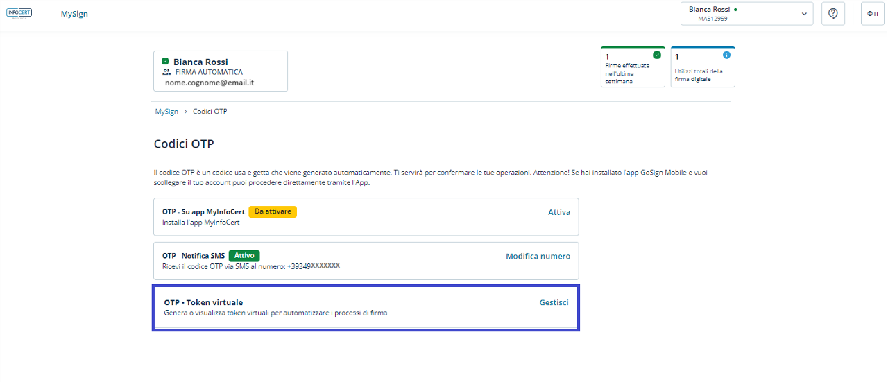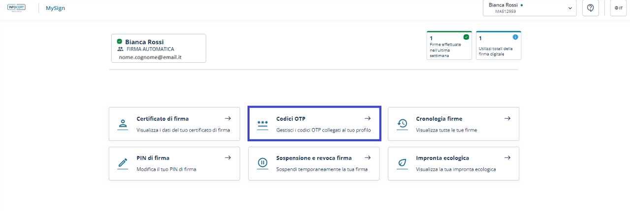 Nella home page di My Sign è possibile gestire il token virtuale entrando nella sezione Codici OTP.