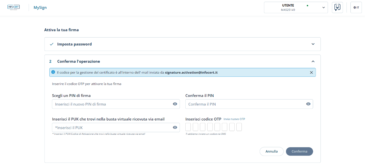 Dopo aver inserito l'OTP è necessario fare clic sul pulsante Conferma.