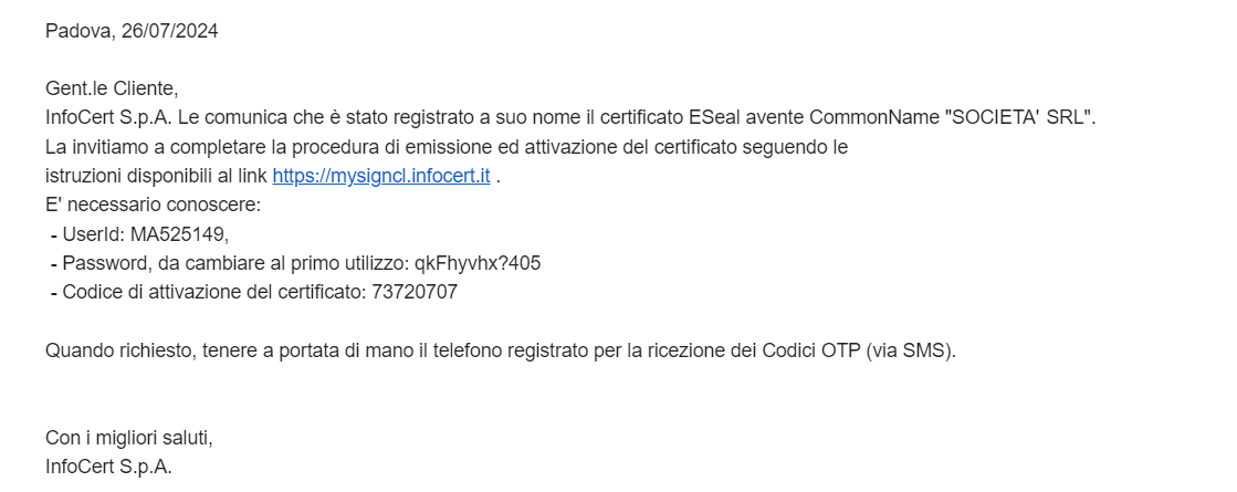 Dopo aver completato la procedura di registrazione per la richiesta del Sigillo Elettronico Qualificato, verrà ricevuta una e-mail contenente le Credenziali per utilizzare il certificato e i Codici di Attivazione.