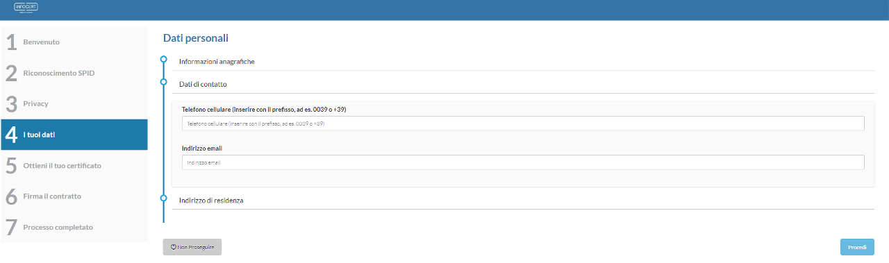 Verranno poi richiesti I dati di contatto: telefono cellulare e indirizzo email. Un click sul tasto Procedi permette di passare allo step successivo.