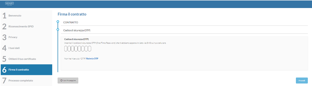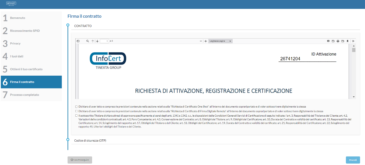 Un clic sul tasto Procedi permetterà di arrivare al passaggio seguente relativo alla firma del contratto.