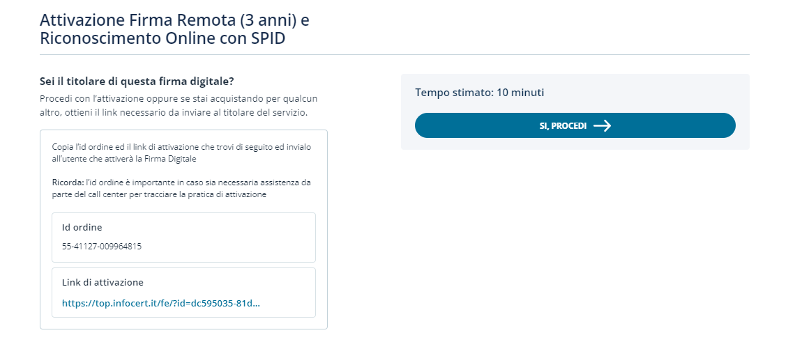 Un click sul tasto Si, procedi permette di accedere alla procedura di attivazione del certificato di firma remota.