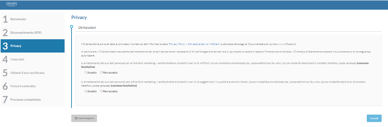 Il punto 3 della procedura di riconoscimento richiede l’accettazione della Privacy Policy da parte dell’utente.