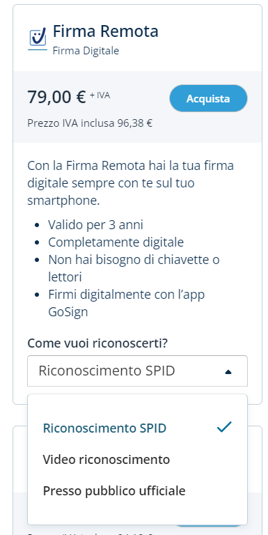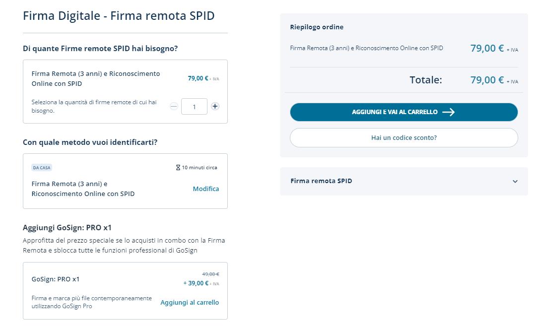 Sullo shop Infocert è possibile selezionare il prodotto "Firma Remota" e scegliere il riconoscimento con SPID.
