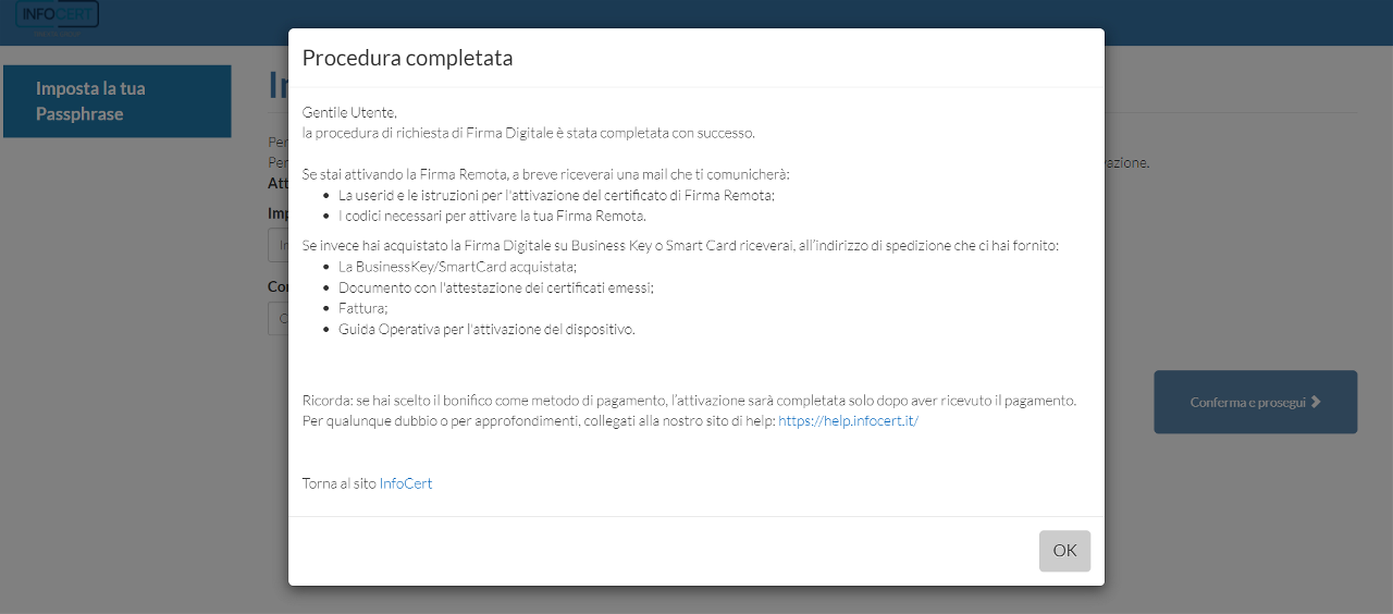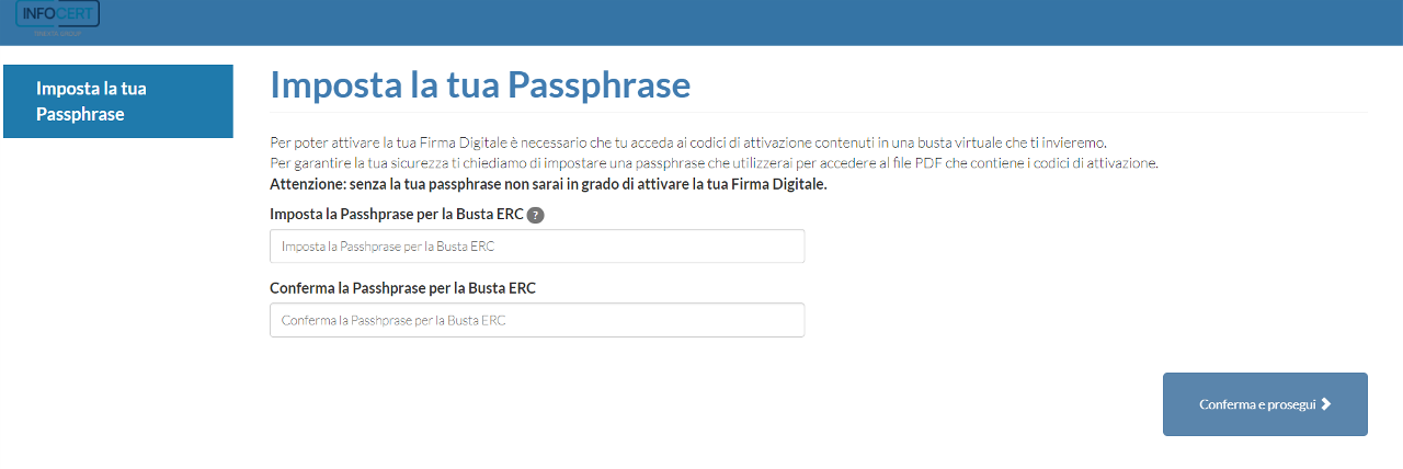 La fase successiva consiste nella scelta della Passphrase, una password personale che permetterà di accedere alla busta virtuale contenente i codici necessari all’attivazione del certificato.