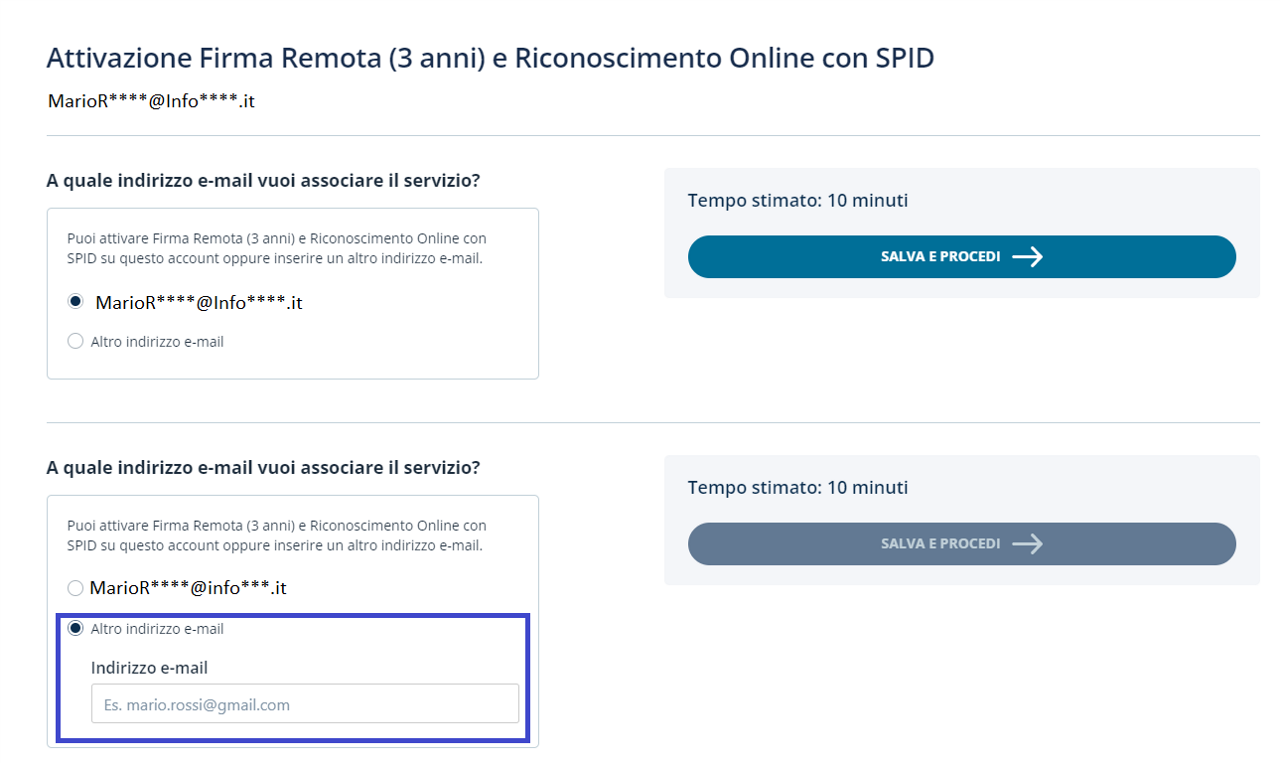 Conclusa la fase di acquisto, è possibile scegliere se associare la firma al proprio account o utilizzare un’e-mail differente: