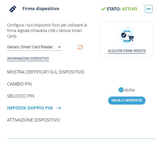 Inoltre, sono disponibili altre funzioni utili per quanto riguarda la sicurezza e l'utilizzo dei dispostivi di firma, come la possibilità di cambiare il PIN, applicare un doppio PIN per aumentare la sicurezza della propria firma e in caso si sbagli il PIN durante il processo di firma, il dispositivo viene bloccato, rendendo il dispositivo inutilizzabile , perciò à presente anche la funzione sblocco PIN.