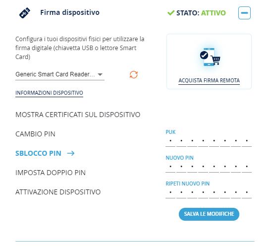 Nell'elenco delle azioni che si possono svolgere sul dispositivo, cliccare sul testo SBLOCCO PIN , inserire di seguito il PIN che attualmente si sta usando e di seguito il nuovo PIN. Il PIN che dovrà essere costituito da 8 caratteri tutti numerici. Ripetere l’inserimento del nuovo PIN e procedere con un clic sul pulsante Conferma.