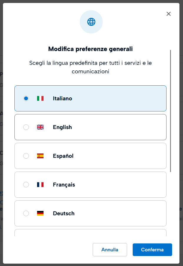 Attraverso il pulsante Cambia lingua puoi modificare la lingua di sistema.