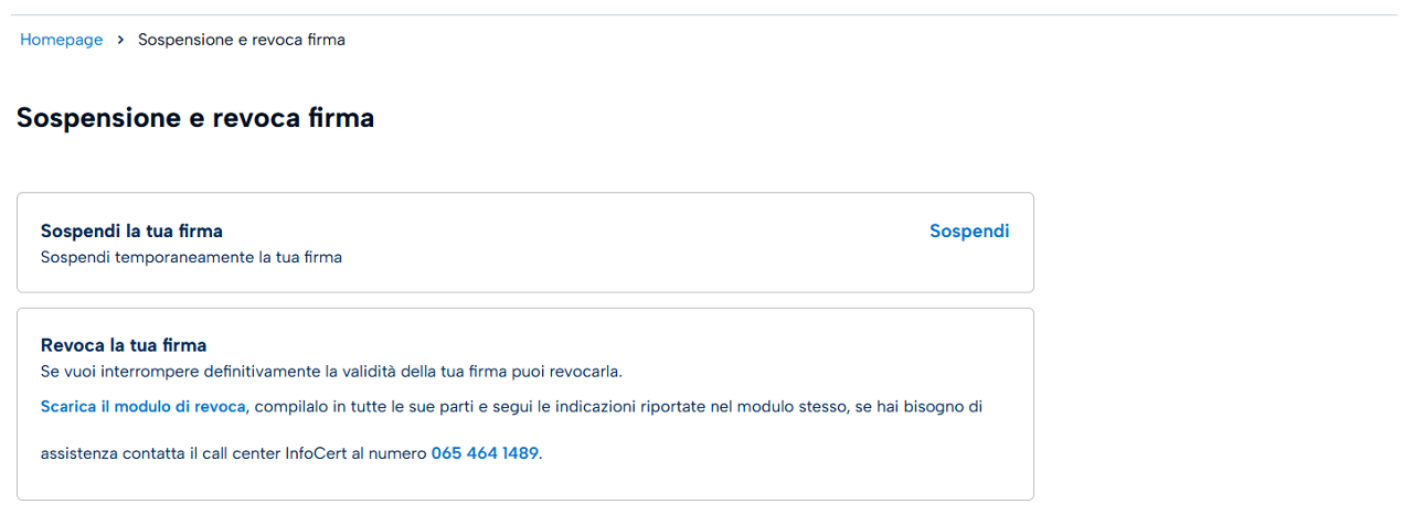 In questa sezione è possibile sospendere temporaneamente la propria firma o revocarla interrompendone definitivamente la validità.