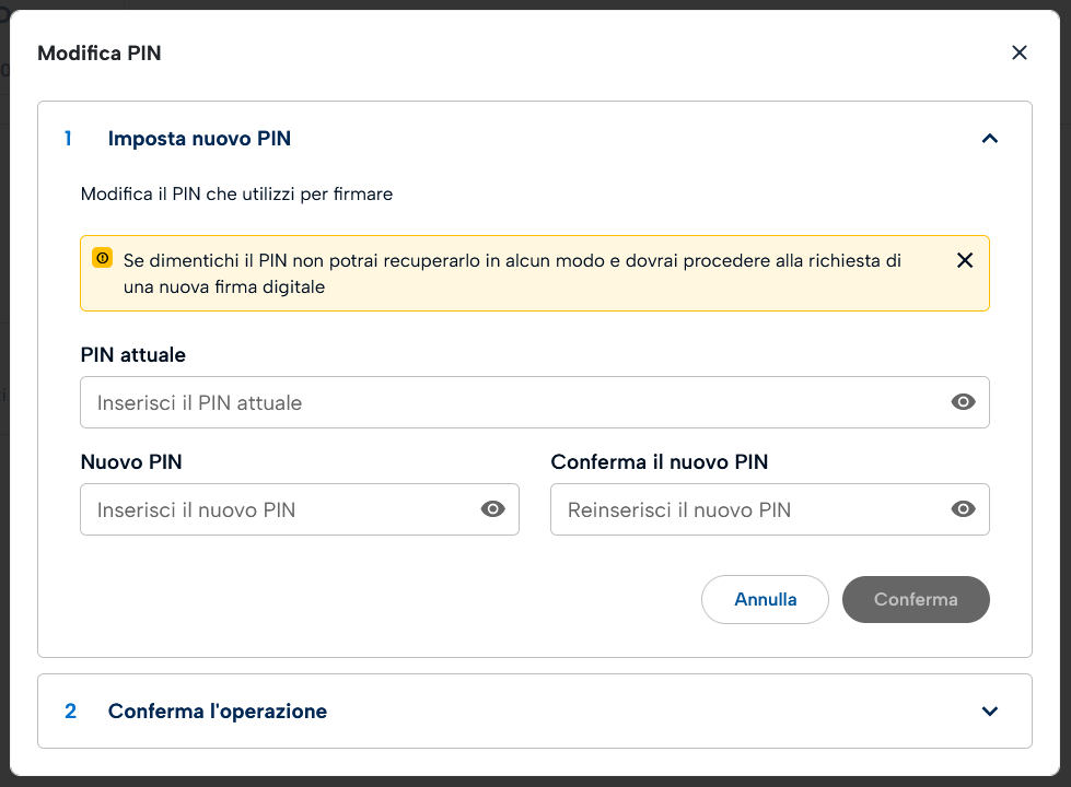 Dopo aver inserito il PIN attuale e quello nuovo, che dovrà essere confermato, si procede con un clic sul pulsante Conferma.