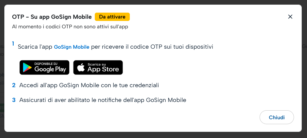 Selezionando l'opzione "OTP - Su App GoSign Mobile" comparirà un pop-up che inviterà ad effettuare il download dell'app GoSign Mobile sul proprio smartphone per collegare l'account di firma e ricevere i codici OTP.