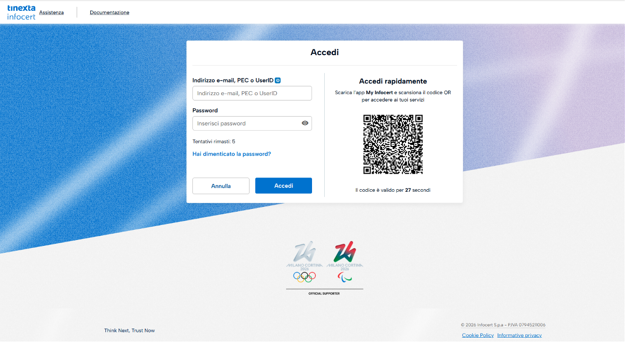 Dopo aver scaricato e configurato l'app My Infocert con le proprie credenziali di Firma, inquadra il QR Code che compare a schermo, attraverso la funzionalità dell'app My Infocert.