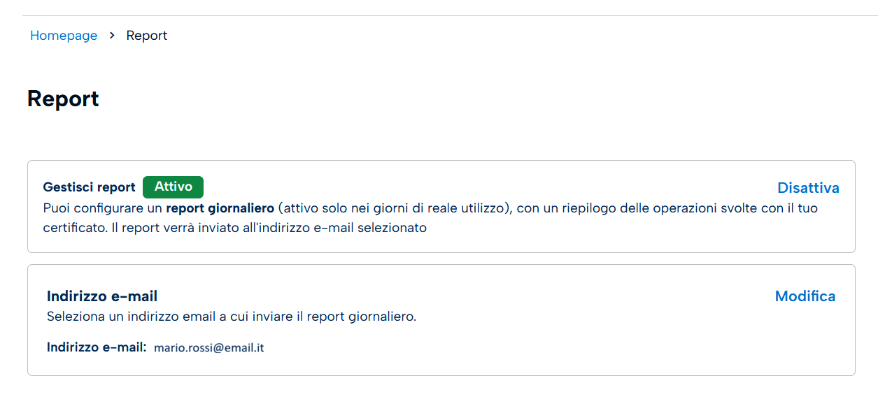 Nella sezione "Report" puoi configurare un report giornaliero con un riepilogo delle operazioni svolte sul certificato in uso.