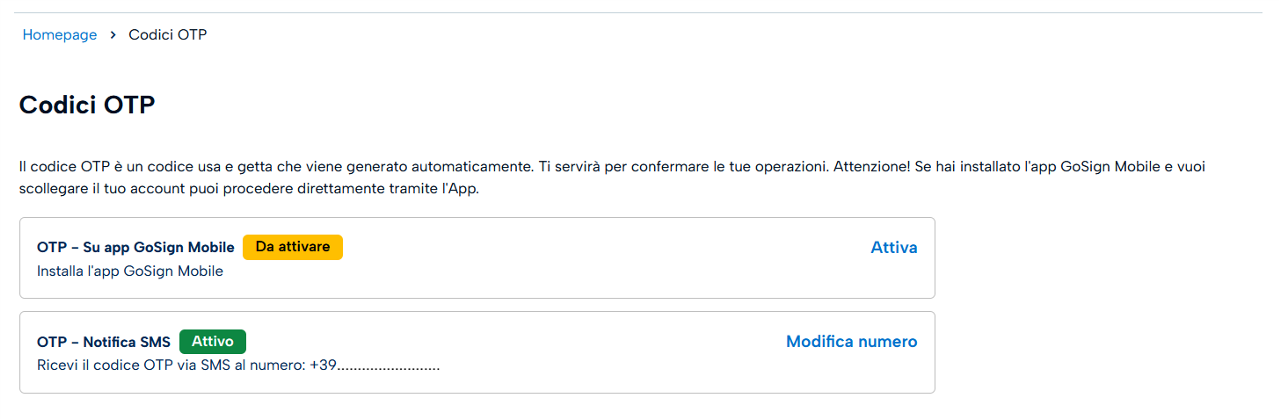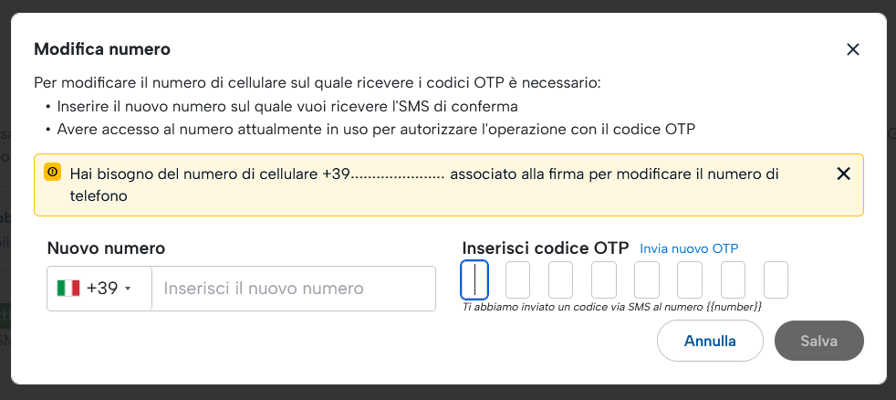 Se si desidera modificare il numero di telefono legato alla ricezione degli otp, è necessario avere accesso al numero attualmente in uso per autorizzare l’operazione.
