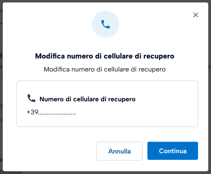 Inserisci il nuovo numero di cellulare di recupero e conferma l'operazione cliccando su Continua.