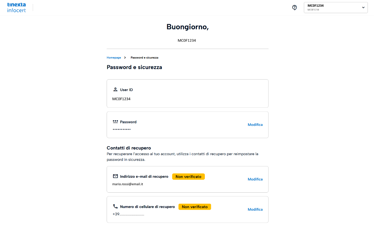 Cliccando su Modifica nel box "Contatti di recupero" puoi modificare l'indirizzo email valido per recuperare le informazioni del tuo account di Firma.