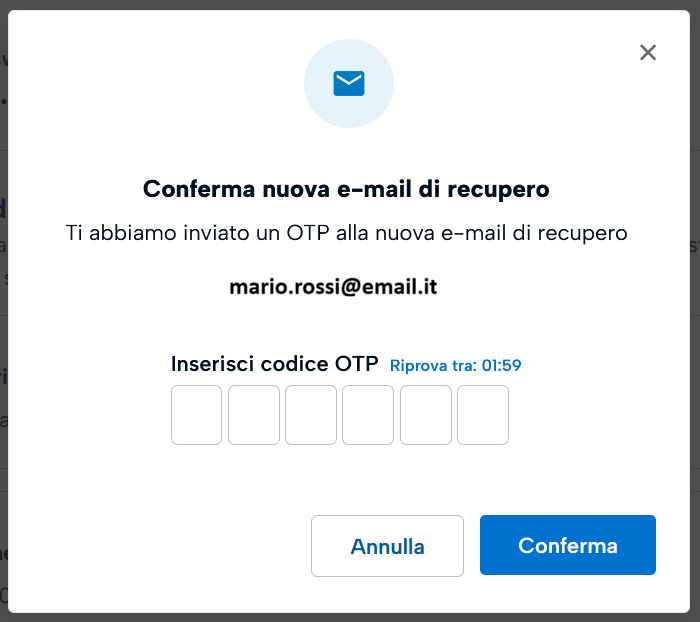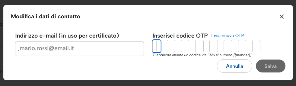 Quindi, vieni chiesta l'autorizzazione a modificare l'indirizzo mail di recupero attraverso l'inserimento di un codice OTP ricevuto sulla nuova email associata all'account di Firma.