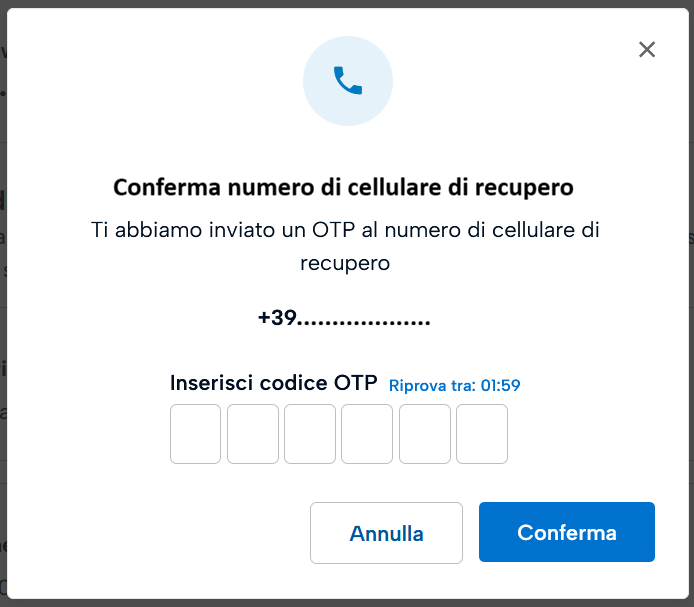 Per procedere con l'operazione è richiesta l'autorizzazione attraverso l'inserimento di un codice OTP ricevuto sul numero di cellulare di recupero attualmente in uso.