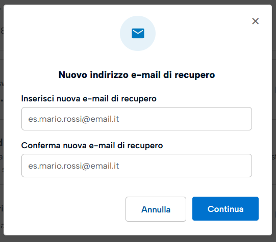 Inserisci il nuovo indirizzo email di recupero e clicca su Continua.