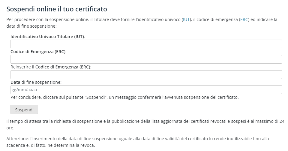 Cliccando su Sospendi si verrà reindirizzati ad un form da compilare con i dettagli relativi alla propria firma per finalizzare l’operazione.