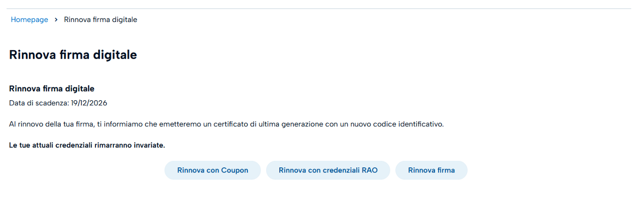 Nella sezione Rinnova firma digitale è possibile visualizzare la scadenza del proprio certificato ed effettuare il rinnovo.