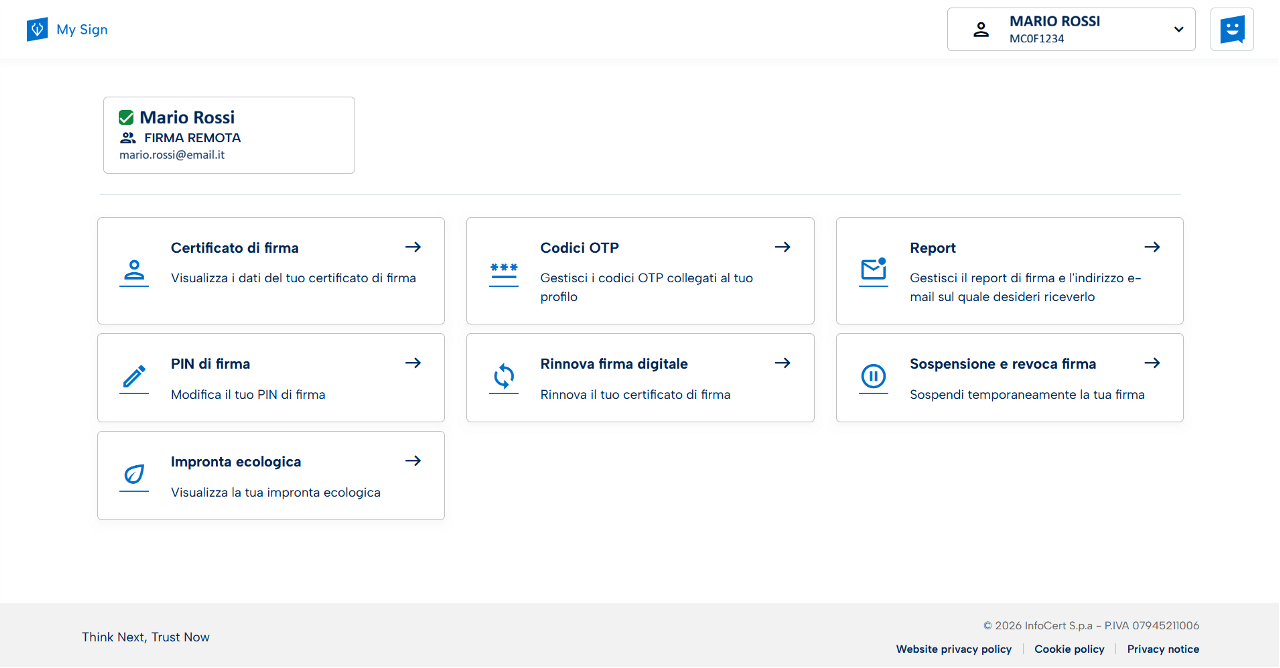 Di seguito la dashboard con le funzionalità disponibili su My Sign.