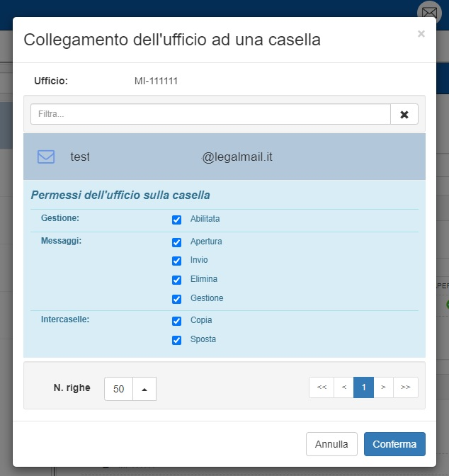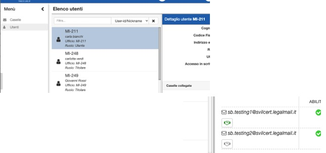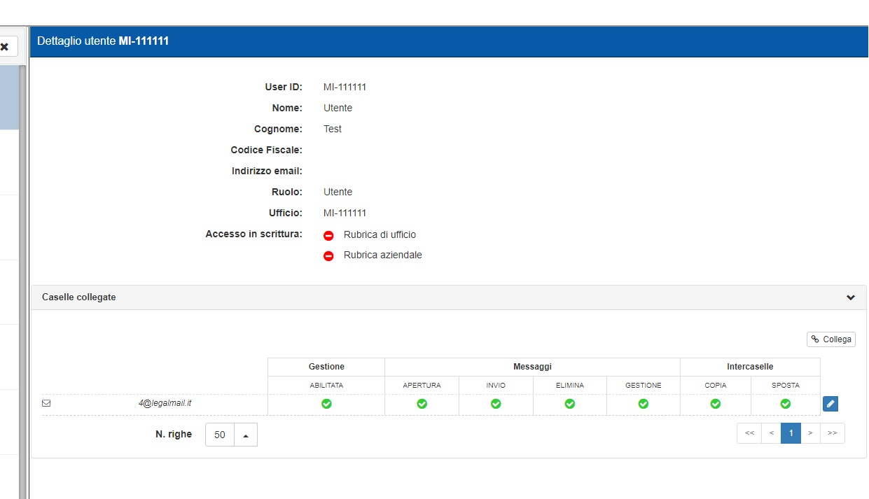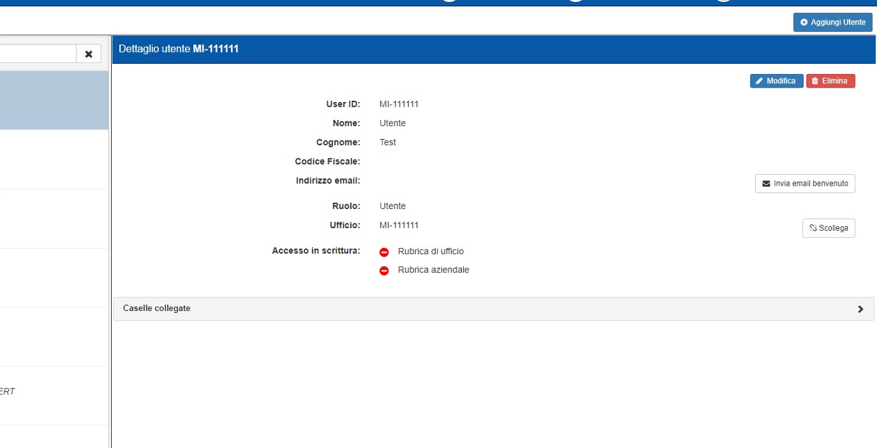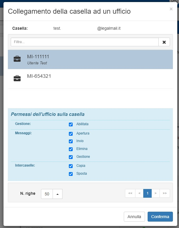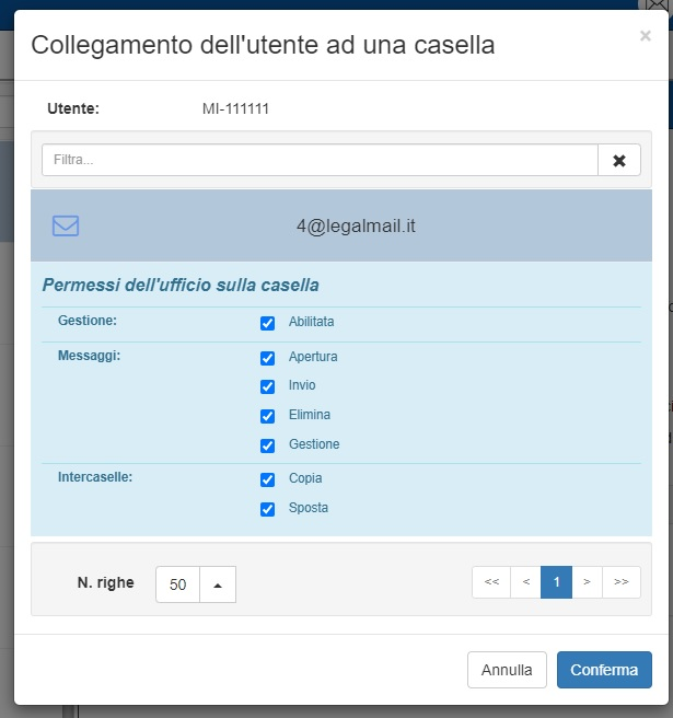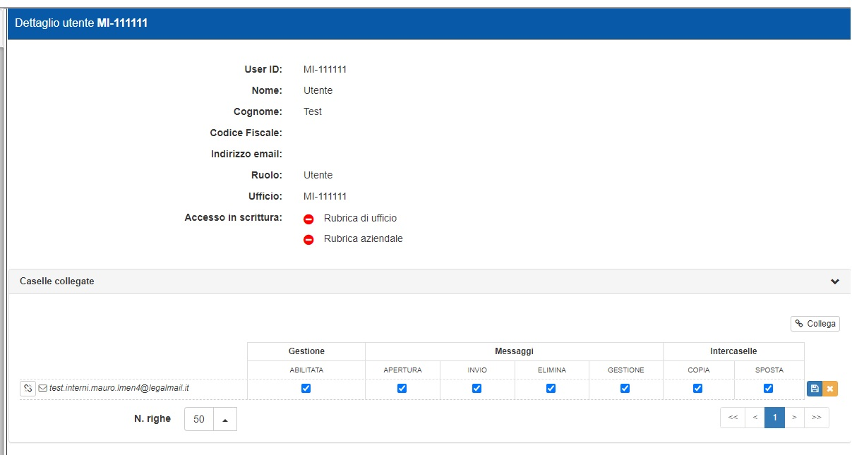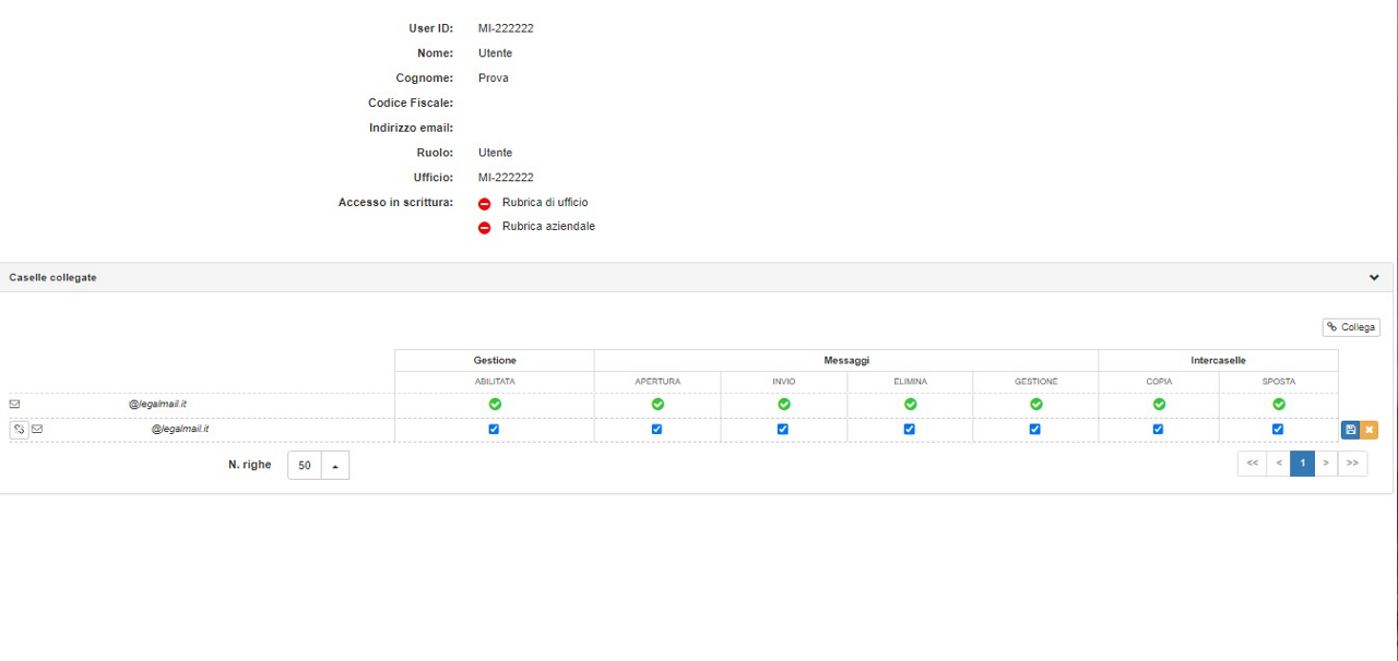 Una volta collegata la casella, questa apparirà nell’elenco delle caselle collegate del relativo utente/ufficio. Qualora sia necessario, è possibile ripetere la procedura più volte per associare più caselle all’utente selezionato.