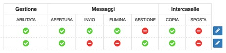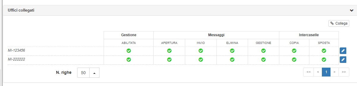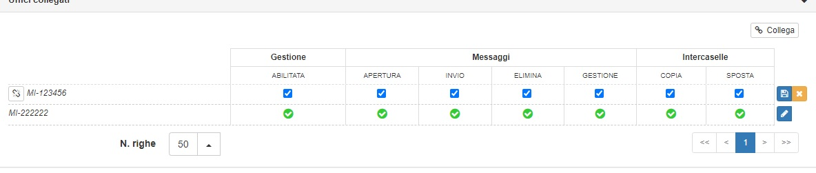 Per rimuovere una casella basterà selezionare il tasto modifica (una matita bianca su sfondo blu) e fare click sul tasto “Scollega”, indicato dall’icona di un anello della catena aperto. L’utilizzo del tasto modifica permetterà anche di gestire i permessi dell’ufficio nei confronti della casella desiderata. Queste modifiche possono essere confermate tramite click sul pulsante “Salva” (icona bianca del floppy disk su sfondo blu) o annullate tramite il pulsante “Annulla” (indicato da una x bianca)