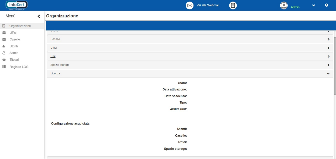 Permette di vedere le informazioni relative alla licenza acquistata. Le informazioni contenute in questa scheda possono essere modificate solo da InfoCert.