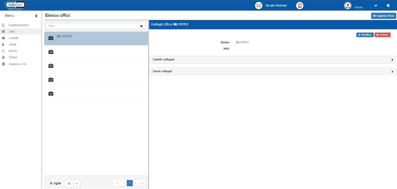 Attraverso questa schermata, è quindi possibile andare a intervenire, a gestire e a creare gli uffici da utilizzare nella soluzione. Si tiene a ricordare che solo gli utenti Admin possono fare tutte le operazioni indicate di seguito agendo direttamente a livello di ufficio. Qualora operazioni analoghe siano disponibili per altri utenti, l’argomento verrà trattato nella sezione corrispondente.