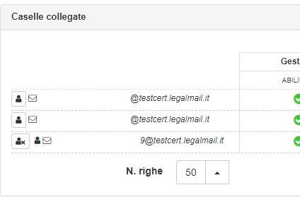 Espandendo la voce “Caselle collegate”, tramite click sulla freccia posta a destra nella sezione omonima, verrà visualizzato l’elenco delle caselle per le quali è possibile assegnare la titolarità. A differenza dell’elenco che viene visualizzato per le utenze normali, per gli utenti Titolari è presente un pulsante, riportante la sagoma di un essere umano, a sinistra del simbolo della busta della casella. Per assegnare la titolarità sarà quindi sufficiente cliccare sul pulsante e, da quel momento, l’utente sarà titolare di quella specifica casella mentre, per rimuoverla, sarà sufficiente premere nuovamente il pulsante di assegnazione di titolarità, che adesso presenterà una piccola “x”. La stessa procedura va ripetuta per tutte le caselle di cui si vuole assegnare la titolarità. Il titolare potrà collegare al massimo 30 delle proprie caselle a un singolo ufficio.