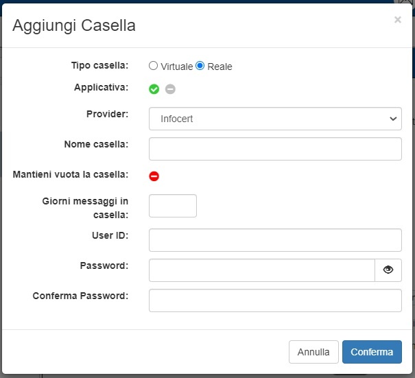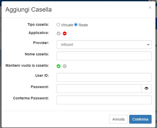 Se si è scelto di aggiungere una casella virtuale, il popup assumerà le sembianze dell’immagine successiva. L’unica operazione necessaria a questo punto è l’inserimento del nome della casella (modificabile in qualunque momento). Una volta fatto il click su “Conferma”, la casella virtuale sarà stata creata e risulterà utilizzabile.