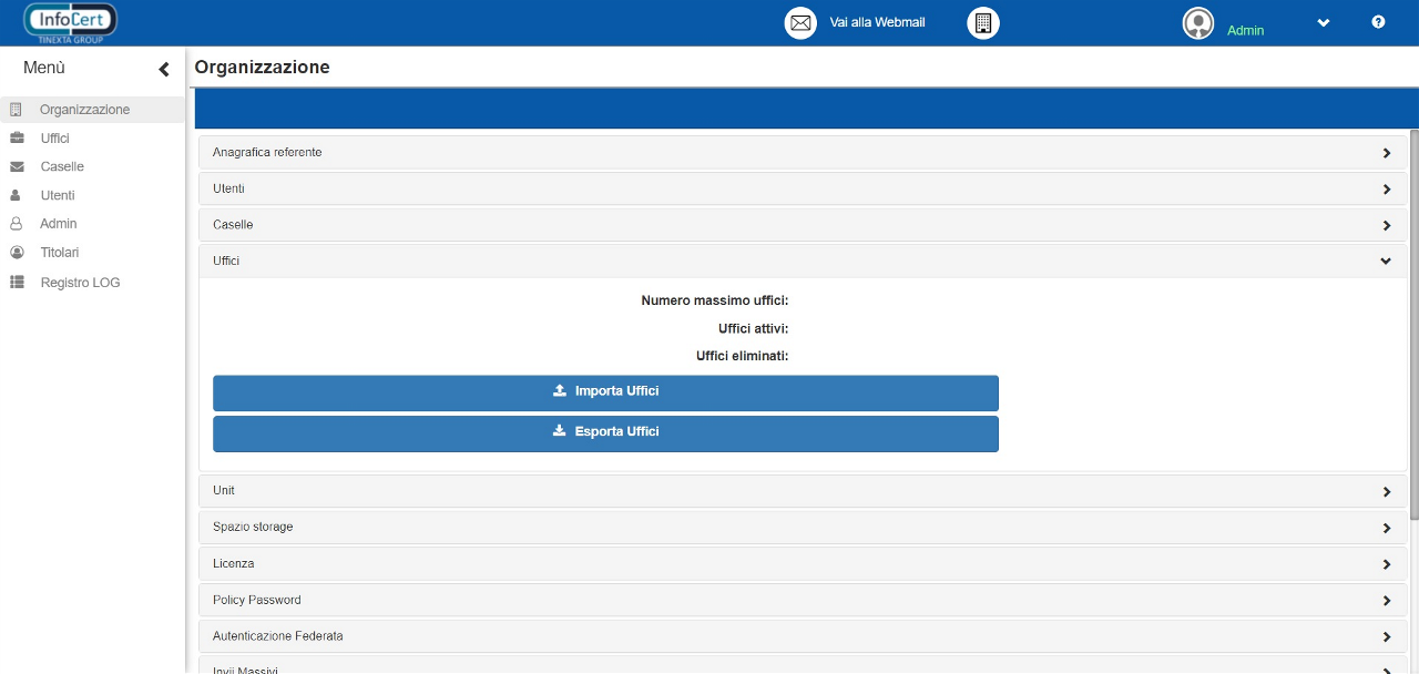 Permette di vedere le numeriche relative al numero massimo di uffici che possono essere attivati, quelle relative al numero di uffici attualmente attivi e quelle degli uffici eliminati. Anche qui viene data la possibilità di importare ed esportare tramite csv i vari uffici, rimanendo comunque un’operazione sconsigliata al neofita.