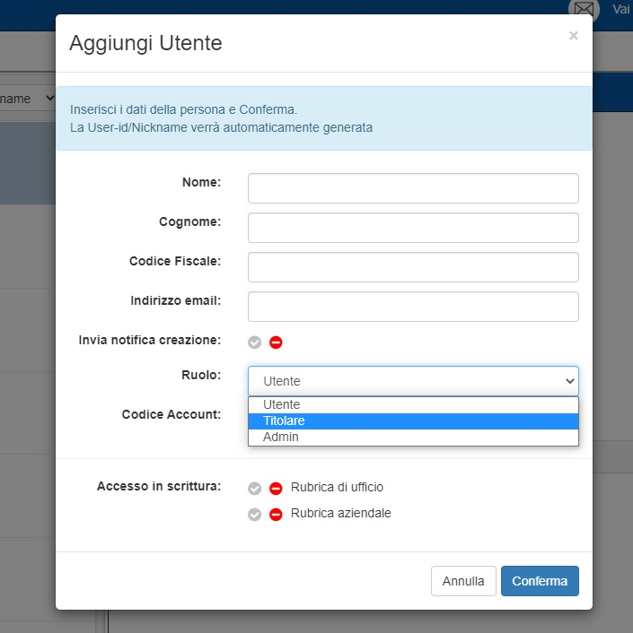 Come è possibile vedere dall’immagine precedente, per creare l’utenza Titolare è necessario agire sul campo “Ruolo”. Espandendo infatti il menù a tendina corrispondente, verrà data al creatore dell’utenza la possibilità di assegnare il ruolo di titolare di caselle al nuovo utente creato.