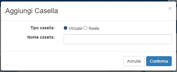 Per aggiungere una nuova casella è necessario fare click sul tasto “Aggiungi casella”. Questo farà apparire un popup che permetterà di scegliere se aggiungere una casella virtuale o reale.