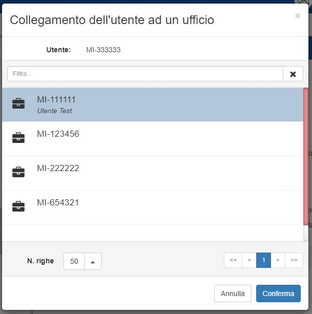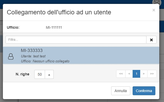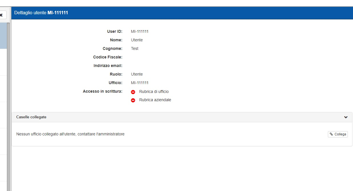 È possibile collegare l’utente a un ufficio a partire dalla schermata di “Dettaglio utente”. Per collegare un utente è innanzitutto necessario che questo non sia ancora associato a un ufficio. A differenza delle caselle, infatti, è permesso che un utente sia collegato esclusivamente a un solo ufficio.