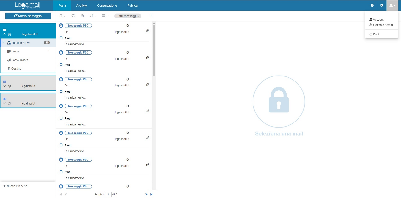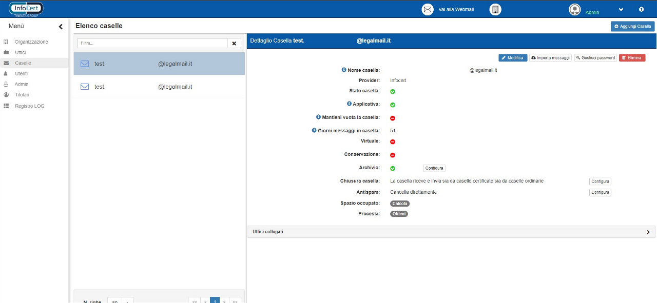 Al centro troviamo l’“Elenco caselle”, dal quale è possibile vedere e ricercare le caselle presenti nella soluzione. A destra, invece, troviamo la schermata di “Dettaglio casella” dalla quale sarà possibile effettuare le operazioni di gestione della casella.