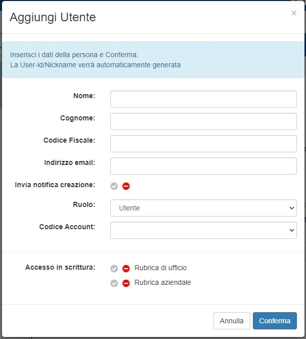 Invia notifica di creazione – permette di scegliere se inviare una email di avvenuta creazione dell’utenza all’utente interessato;