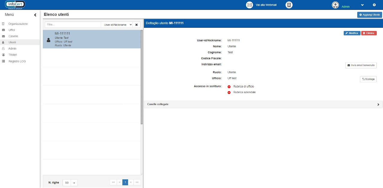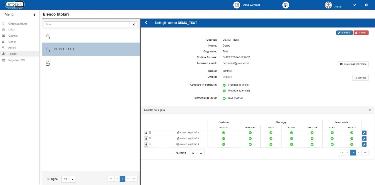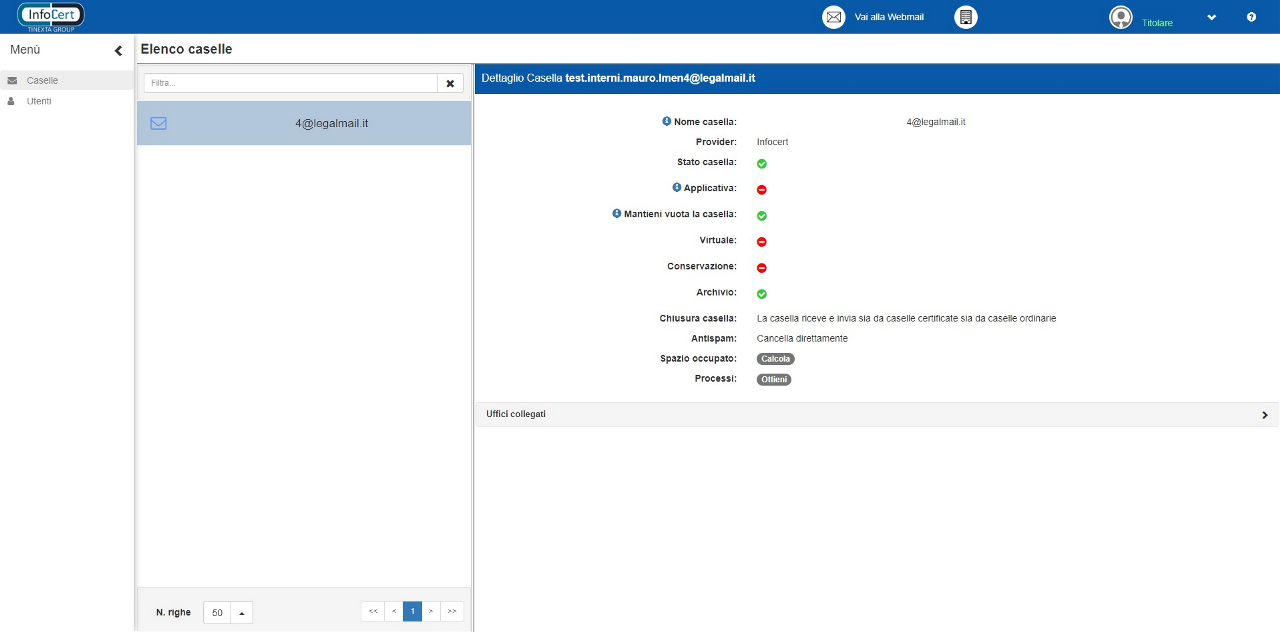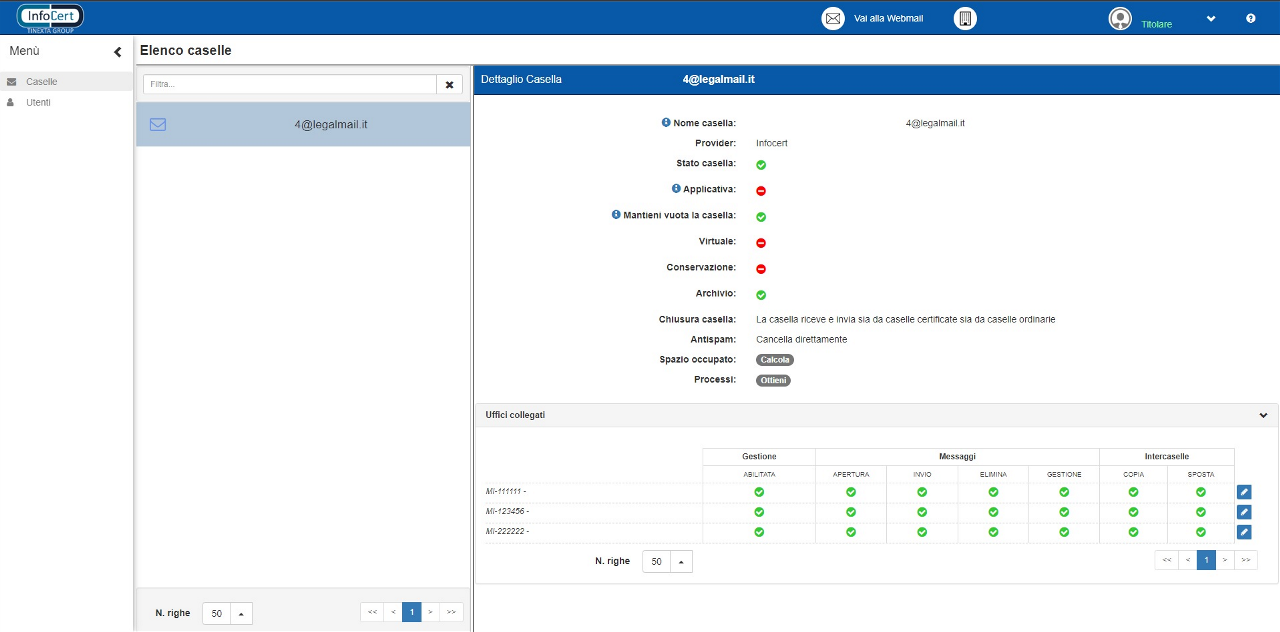 Da qui l’utente Titolare può visualizzare la scheda “Utenti”, collegare gli stessi alle proprie caselle e gestirne i relativi permessi individuali. È ovviamente possibile collegare alla propria casella anche utenti titolari di altre caselle. Dall’elenco caselle sarà pure possibile, espandendo la sezione “Uffici collegati”, sarà possibile vedere l’elenco degli uffici collegati alla casella.