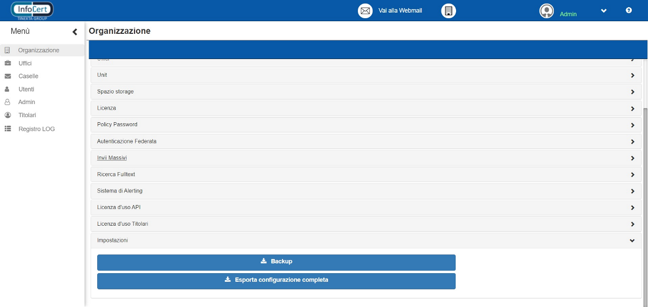 Questa scheda permette di esportare la configurazione dell’organizzazione su un file csv scegliendo se effettuare il backup (esportando i nomi delle caselle, degli uffici collegati a questi, degli utenti collegati con i relativi permessi) o l’esportazione completa (che aggiunge anche i permessi dei vari uffici).