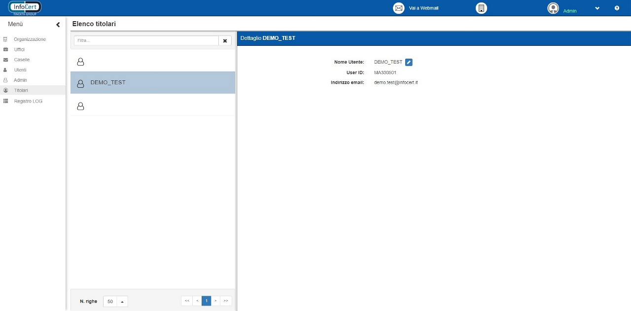 Per assegnare la titolarità di una o più caselle, sarà sufficiente cliccare sul tasto posto a destra del nome dell’utente per far apparire la schermata di “Dettaglio Utente”.
