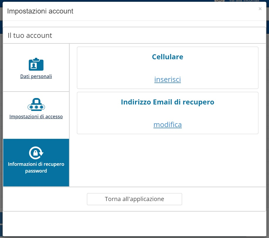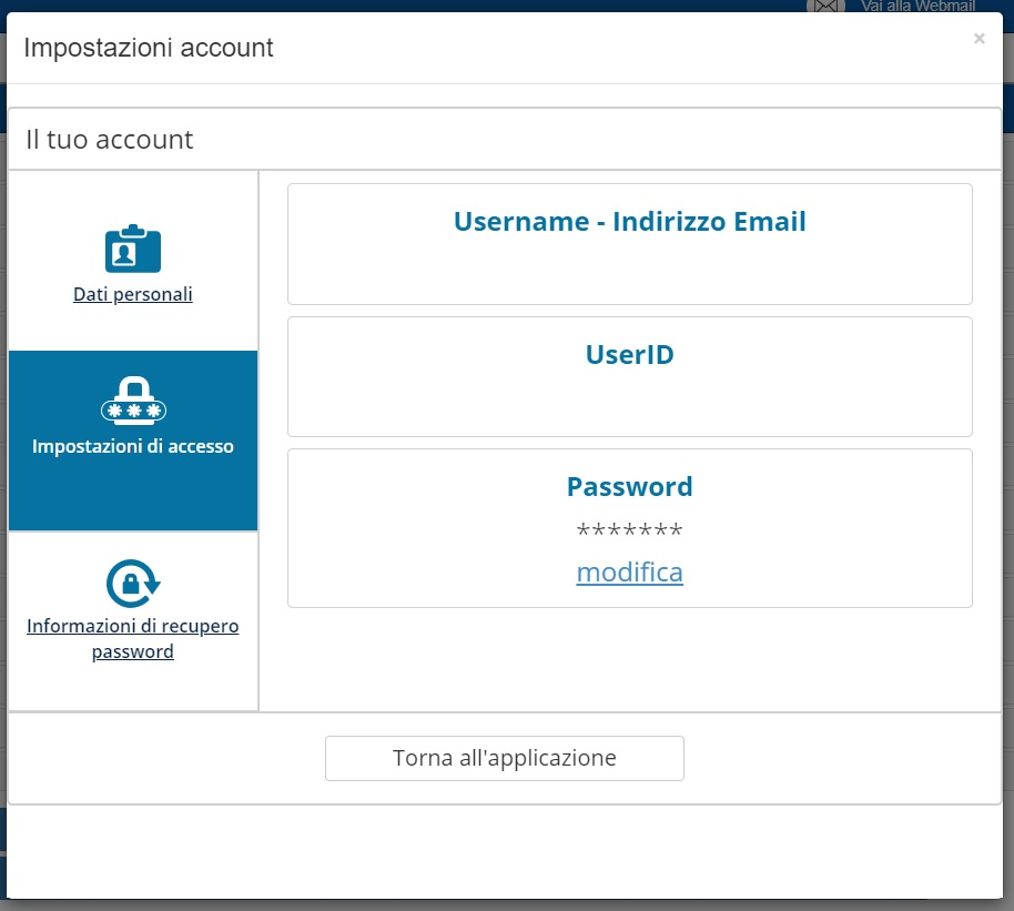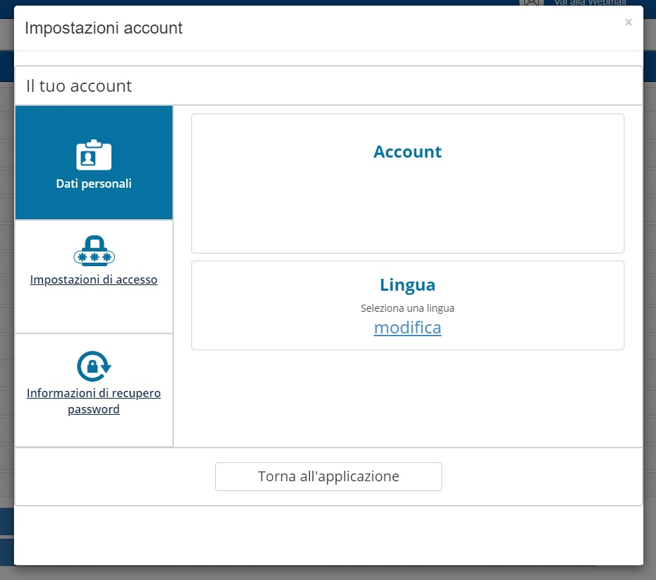 Utilizzando la funzione “Cambio password” l’utente aprirà in popup il menù “Impostazione account” dal quale potrà visualizzare tre sezioni: