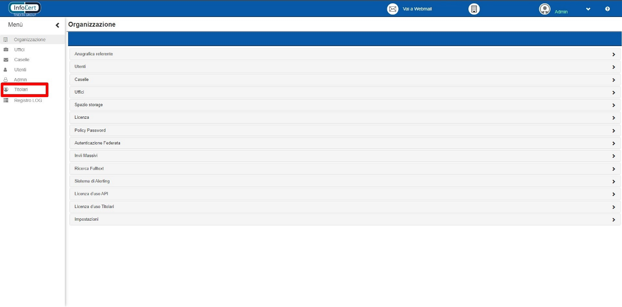 Come precedentemente accennato, l’utente Titolare ha dei limitati permessi di amministrazione. Una volta aperta la console admin, l’utente Titolare avrà visibilità della seguente schermata.