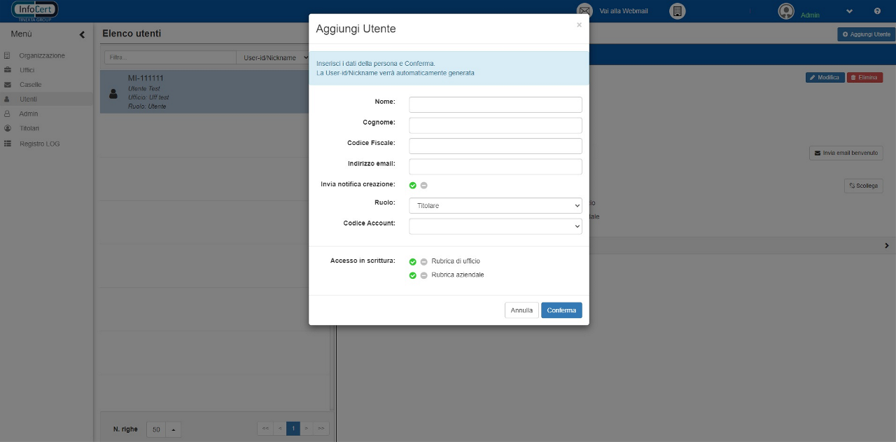Per confermare la creazione, è sufficiente fare click sul tasto “Conferma”. L’utente appena creato riceverà due email: una dal sistema di gestione identità di InfoCert, che gli permetterà di definire la password d’accesso e una dal sistema di notifica della creazione dell’utenza, qualora sia stata abilitata questa opzione.
